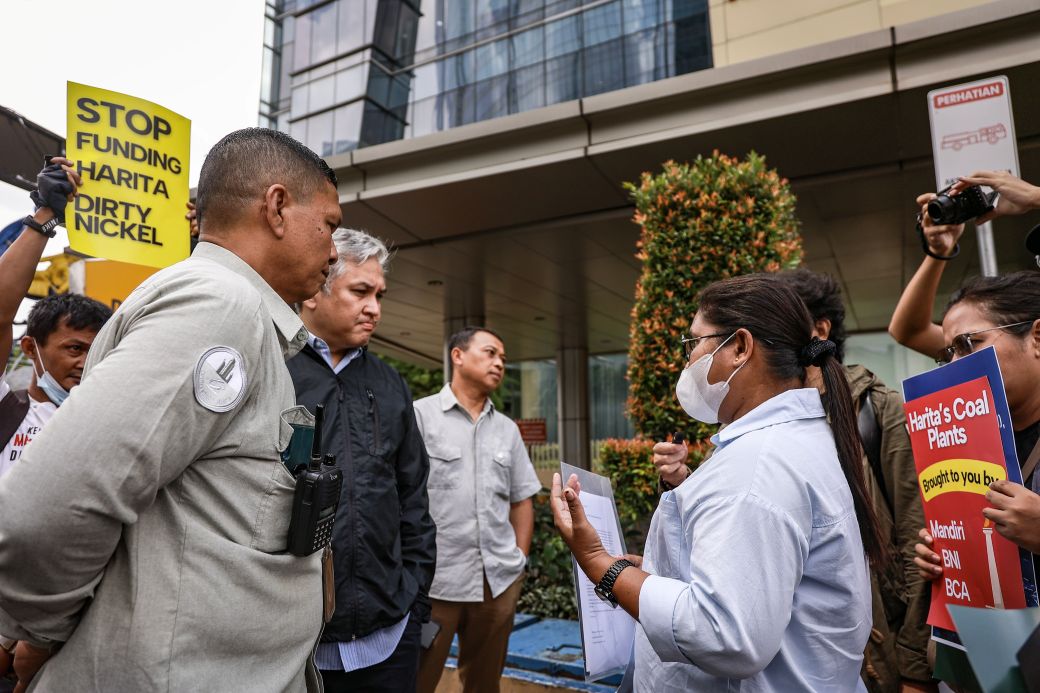Aksi ditutup dengan penyerahan laporan sekaligus surat terbuka oleh dua pendeta dari Pulau Obi. Mereka mendesak OCBC, UOB, DBS, Maybank, CIMB dan Bank Mandiri untuk tidak lagi memberikan dukungan pendanaan terhadap grup Harita demi keberlangsungan hidup warga pulau Obi dan generasi selanjutnya.