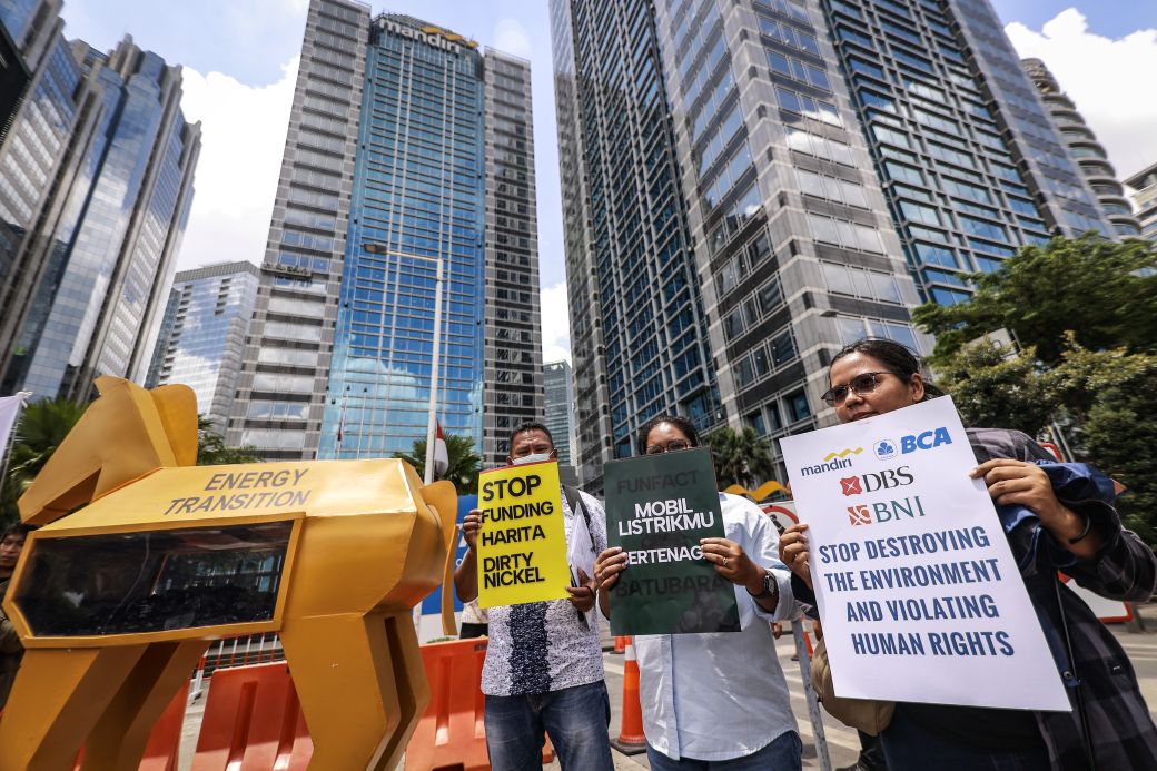 Jakarta, 1 Oktober 2025 — Sejumlah organisasi masyarakat sipil yang terdiri dari Market Forces, Enter Nusantara, JATAM, dan Trend Asia, bersama dua pendeta dari Obi menggelar aksi teatrikal di depan kantor bank-bank yang masih mendanai operasi smelter nikel milik grup Harita di Pulau Obi, Maluku Utara.